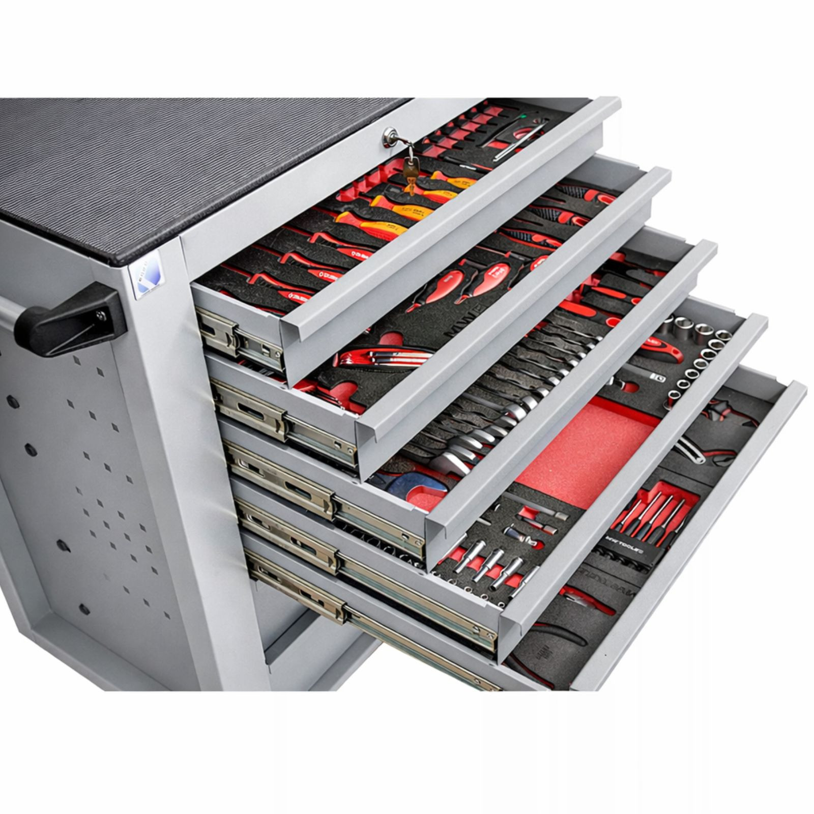 Náradie je vyrobené z kvalitnej Cr-V ocele, ktorá zaručuje vysokú pevnosť, odolnosť voči opotrebeniu a dlhú životnosť. Jednotlivé komponenty sú prehľadne uložené v penových organizéroch, ktoré uľahčujú rýchlu orientáciu, jednoduché skladovanie a udržiavanie poriadku v dielni.