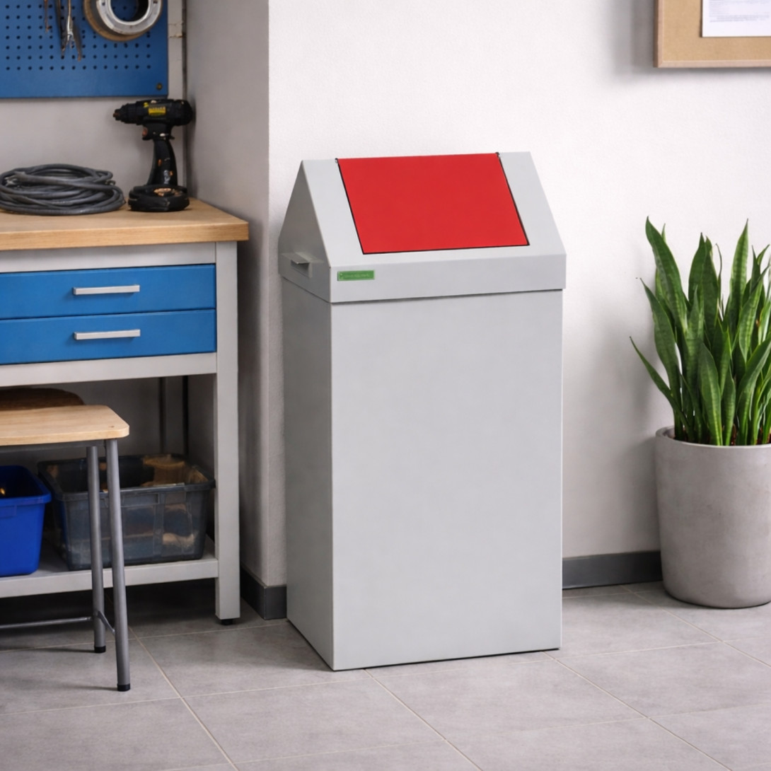 Kôš má objem 90 litrov a je vybavený pohyblivým vekom, ktoré zabezpečuje hygienické a pohodlné používanie. Odnímateľná horná časť uľahčuje manipuláciu, vyprázdňovanie aj údržbu. Vďaka pevnej konštrukcii a hmotnosti 12 kg je kôš stabilný a vhodný na každodenné používanie v kanceláriách, školách, výrobných halách aj spoločných priestoroch.