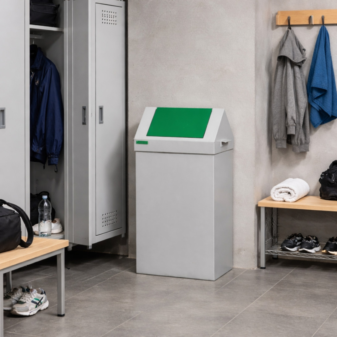 Kôš má objem 90 litrov a je vybavený pohyblivým vekom, ktoré zabezpečuje hygienické a pohodlné používanie. Odnímateľná horná časť uľahčuje manipuláciu, vyprázdňovanie aj údržbu. Vďaka pevnej konštrukcii a hmotnosti 12 kg je kôš stabilný a vhodný na každodenné používanie v kanceláriách, školách, výrobných halách aj spoločných priestoroch.