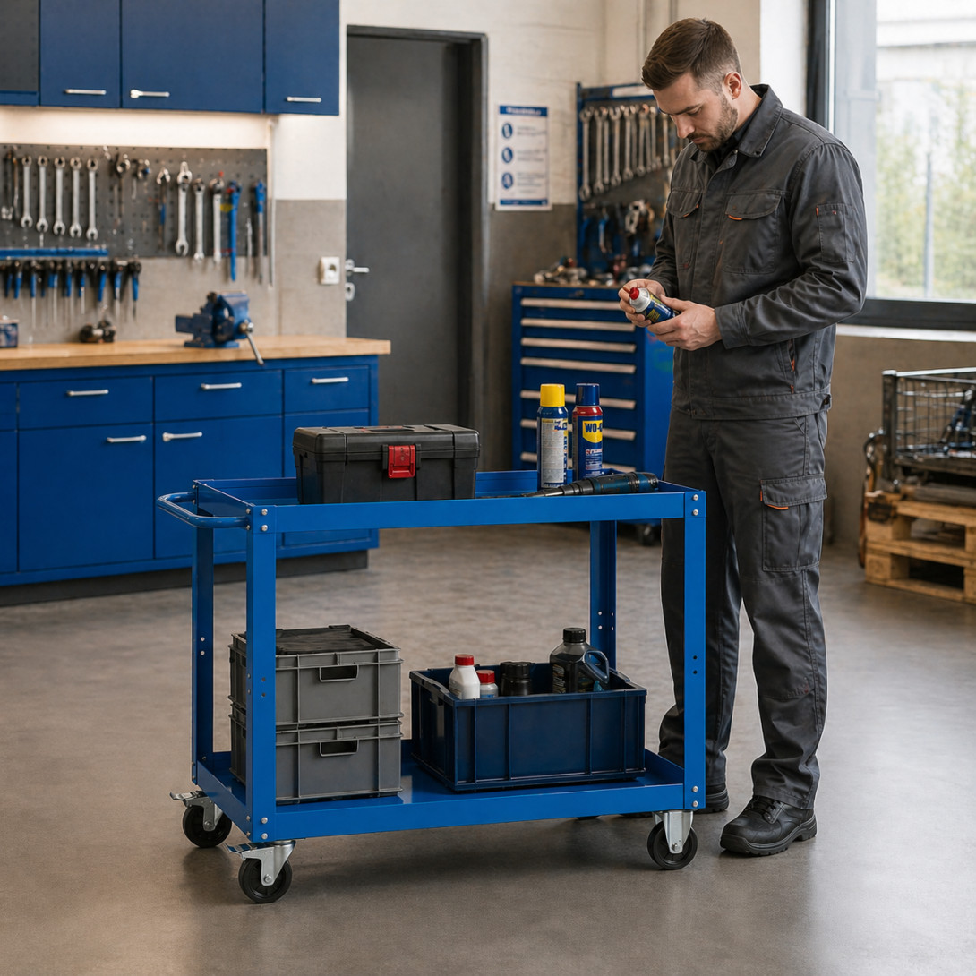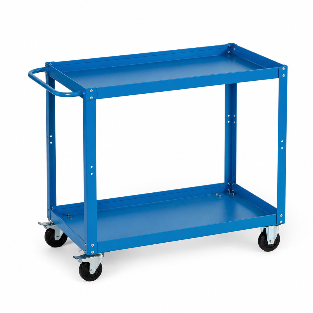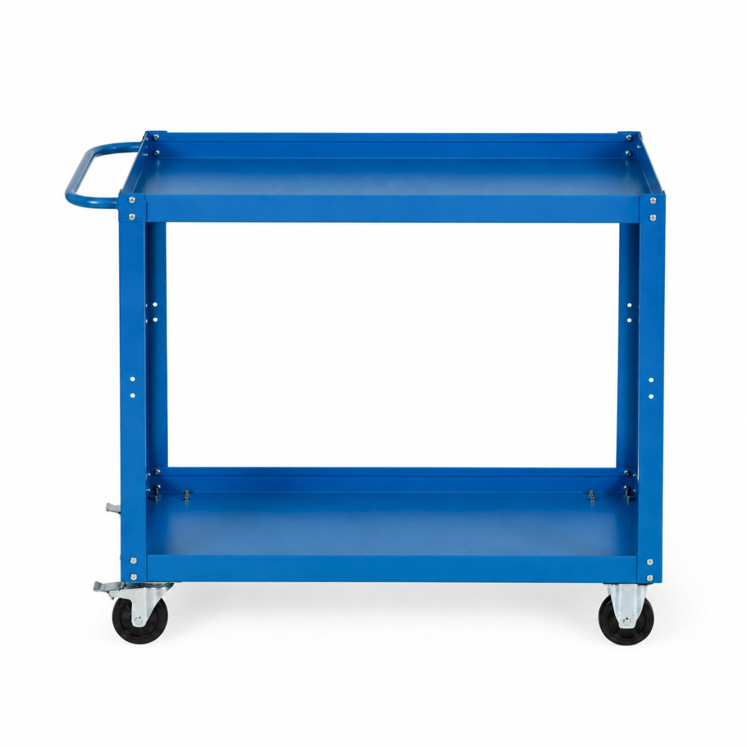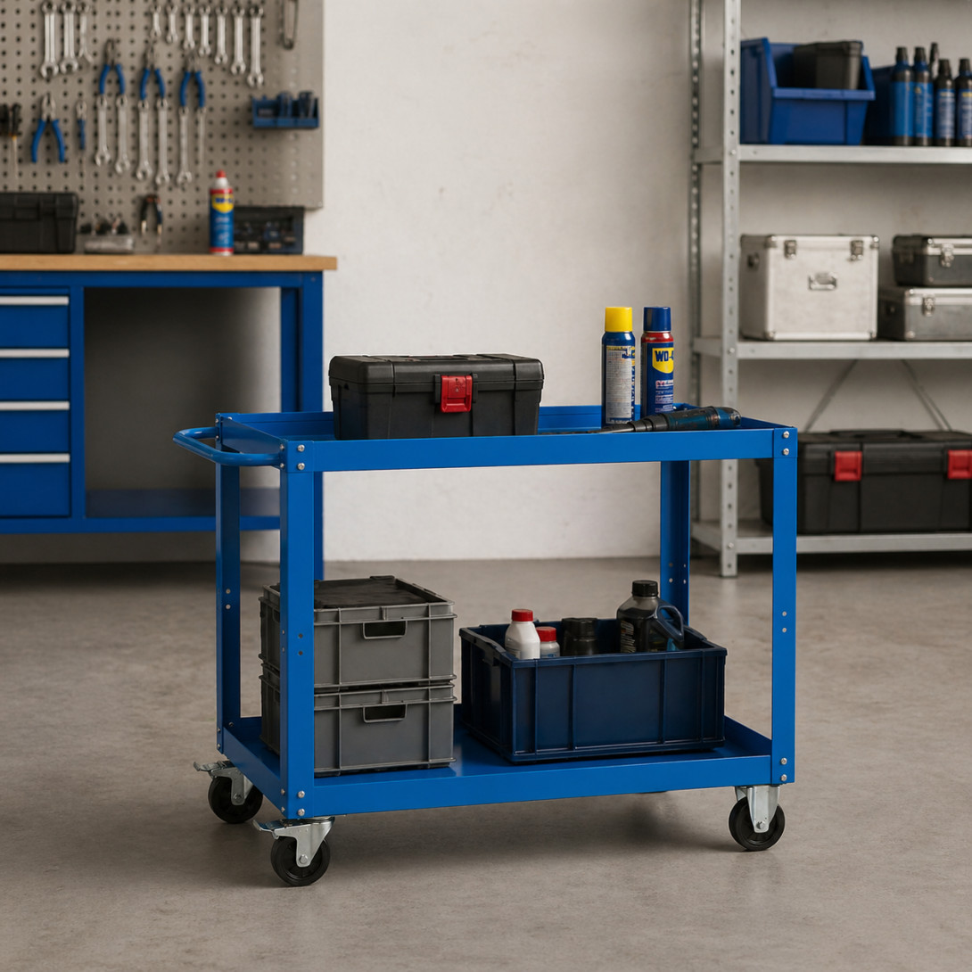 Vozík ponúka dve priestranné police, ktoré poskytujú dostatok úložného priestoru na organizované uskladnenie náradia, komponentov či pracovných pomôcok. Stabilná oceľová konštrukcia je ošetrená kvalitným práškovým lakom v základnej farbe RAL 5015 (modrá), čo zvyšuje odolnosť voči mechanickému poškodeniu a opotrebovaniu.