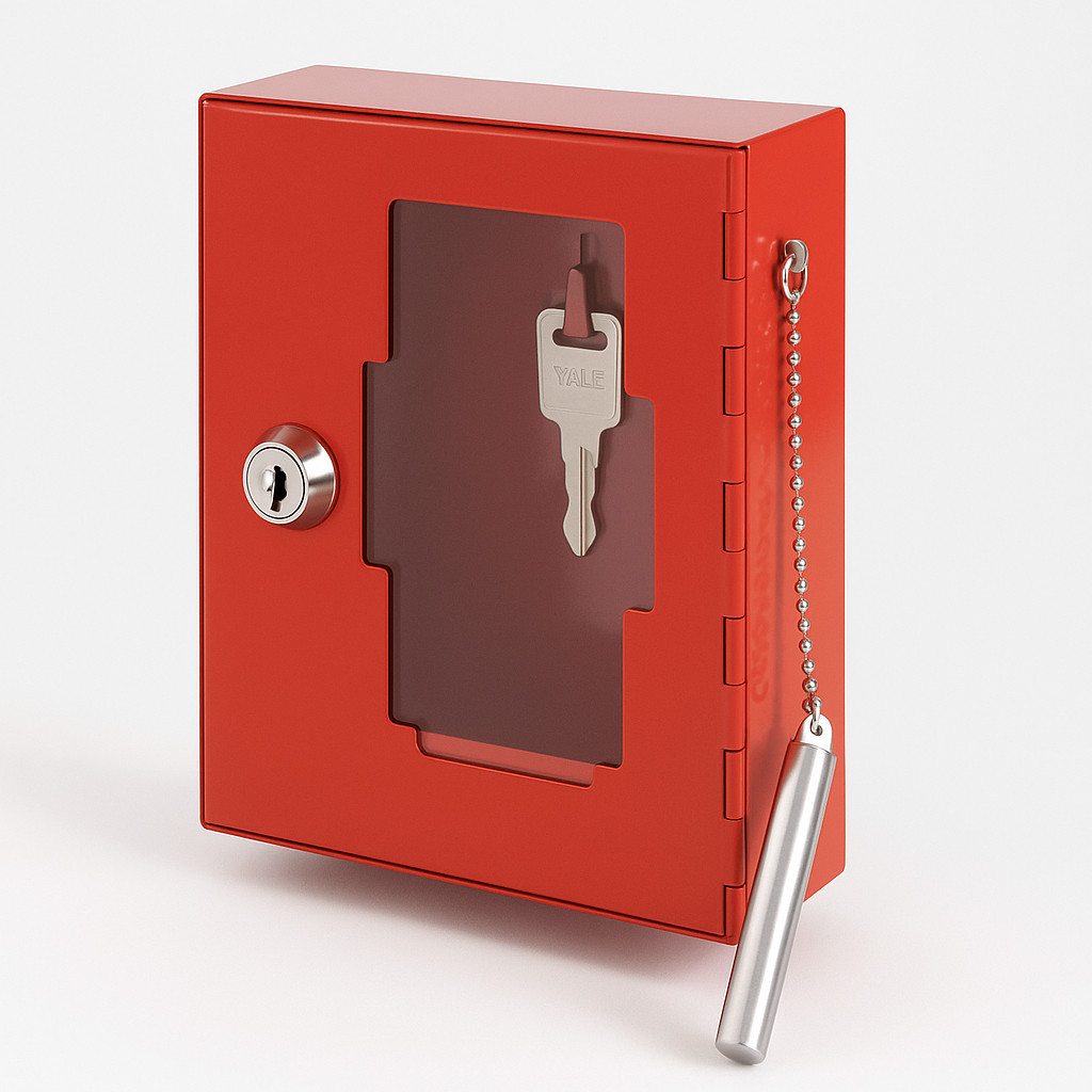 Skrinka je vybavená bezpečnostným zámkom s dvomi kľúčmi, oceľovým skeletom, vymeniteľným sklíčkom a kladivkom na jeho rozbitie. Pevná konštrukcia a odolná povrchová úprava zabezpečujú spoľahlivú ochranu uloženého obsahu a jednoduchú údržbu. Vymeniteľné sklíčko umožňuje rýchlu a úspornú servisnú výmenu bez potreby meniť celú skrinku.