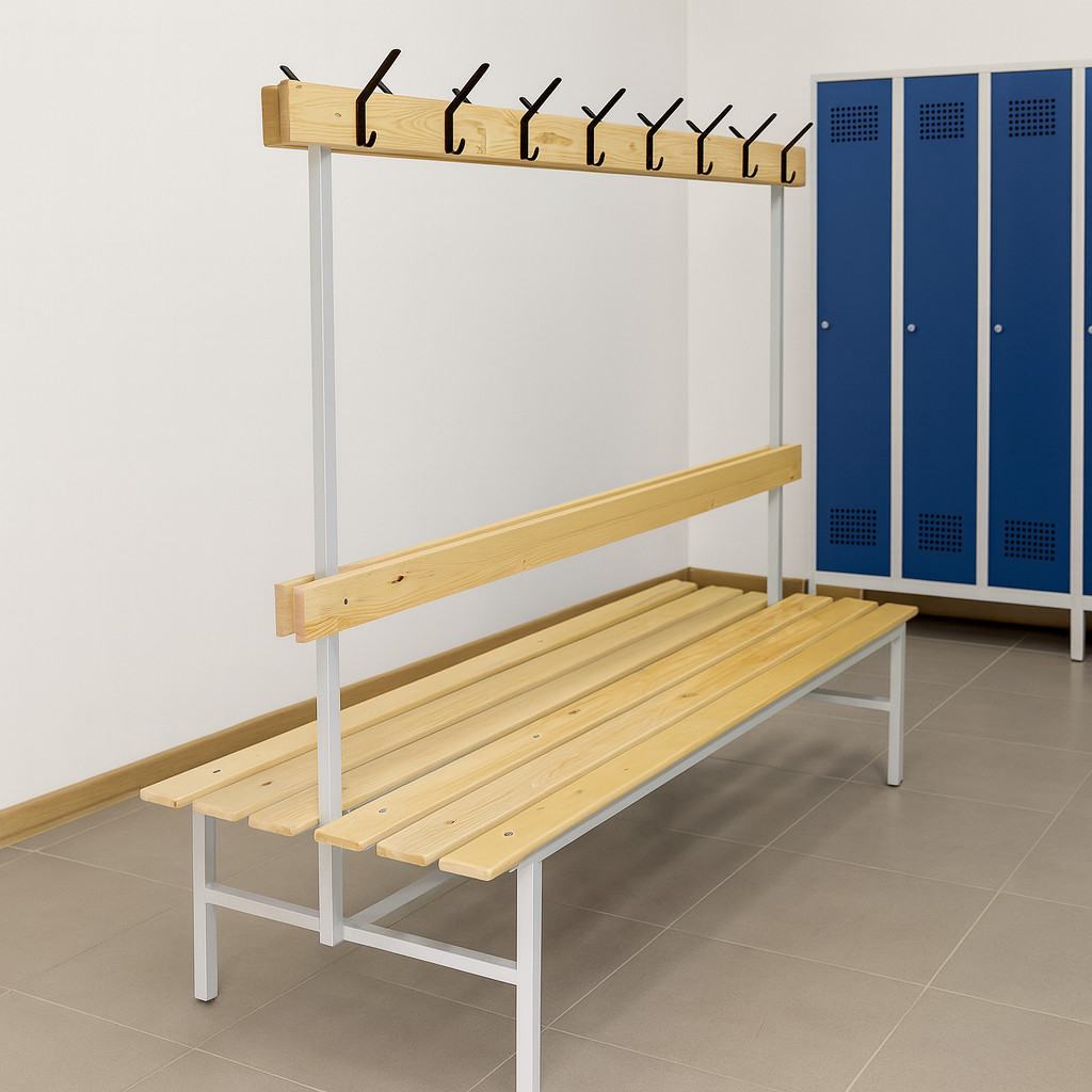 Obojstranná šatníková lavica s opierkou a vešiakmi s dĺžkou 1500 mm je praktickým a odolným vybavením do šatní, športových zariadení či fitness centier. Sedacia časť je vyrobená z lipového dreva, ktoré poskytuje pohodlie pri sedení, a pevná kovová konštrukcia zaručuje stabilitu aj dlhú životnosť. Lavica je vybavená 16 háčikmi na zavesenie odevov a jej rozmery sú 1500 × 1600 × 690 mm. Hľadáte iný rozmer? Pozrite si našu celú ponuku lavíc.
