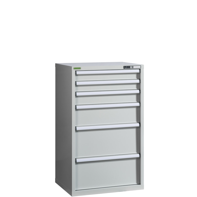Povrchová úprava je riešená odolným práškovým lakom v odtieni RAL 7035 (svetlosivá), ktorý chráni konštrukciu a zároveň pôsobí neutrálne v každom pracovnom prostredí. Praktické madlá zásuviek umožňujú jednoduché označenie obsahu pre lepšiu orientáciu.