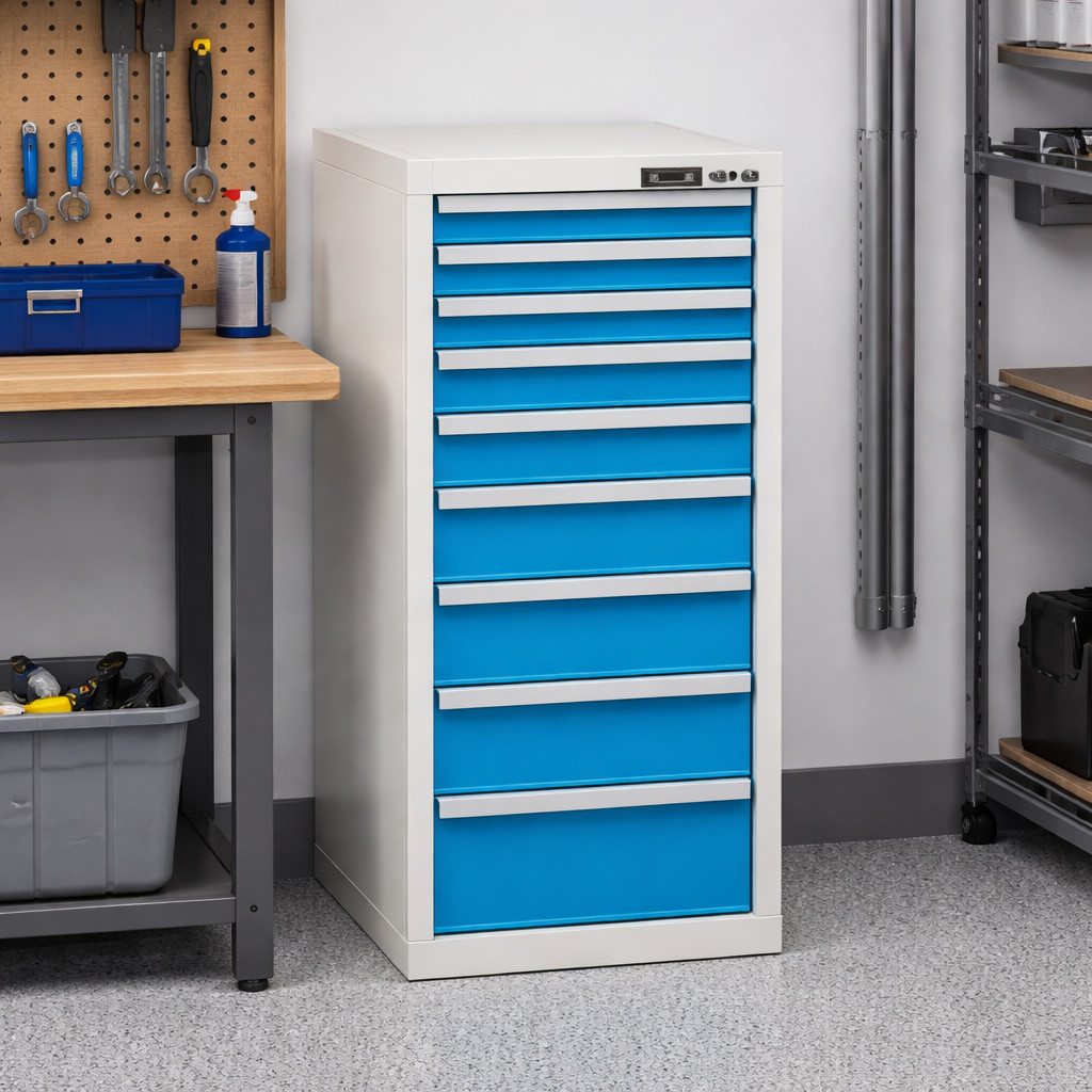 Vďaka 9 zásuvkám rôznych veľkostí s modrým čelom poskytuje kontajner flexibilné uloženie drobného náradia, spojovacieho materiálu aj kancelárskych pomôcok. Pevná konštrukcia z kvalitného oceľového plechu zabezpečuje stabilitu a dlhú životnosť, pričom perforované vnútro s rozostupmi po 25 mm umožňuje jednoduché prestavenie vodiacich líšt zásuviek bez použitia náradia – presne podľa aktuálnych potrieb používateľa.