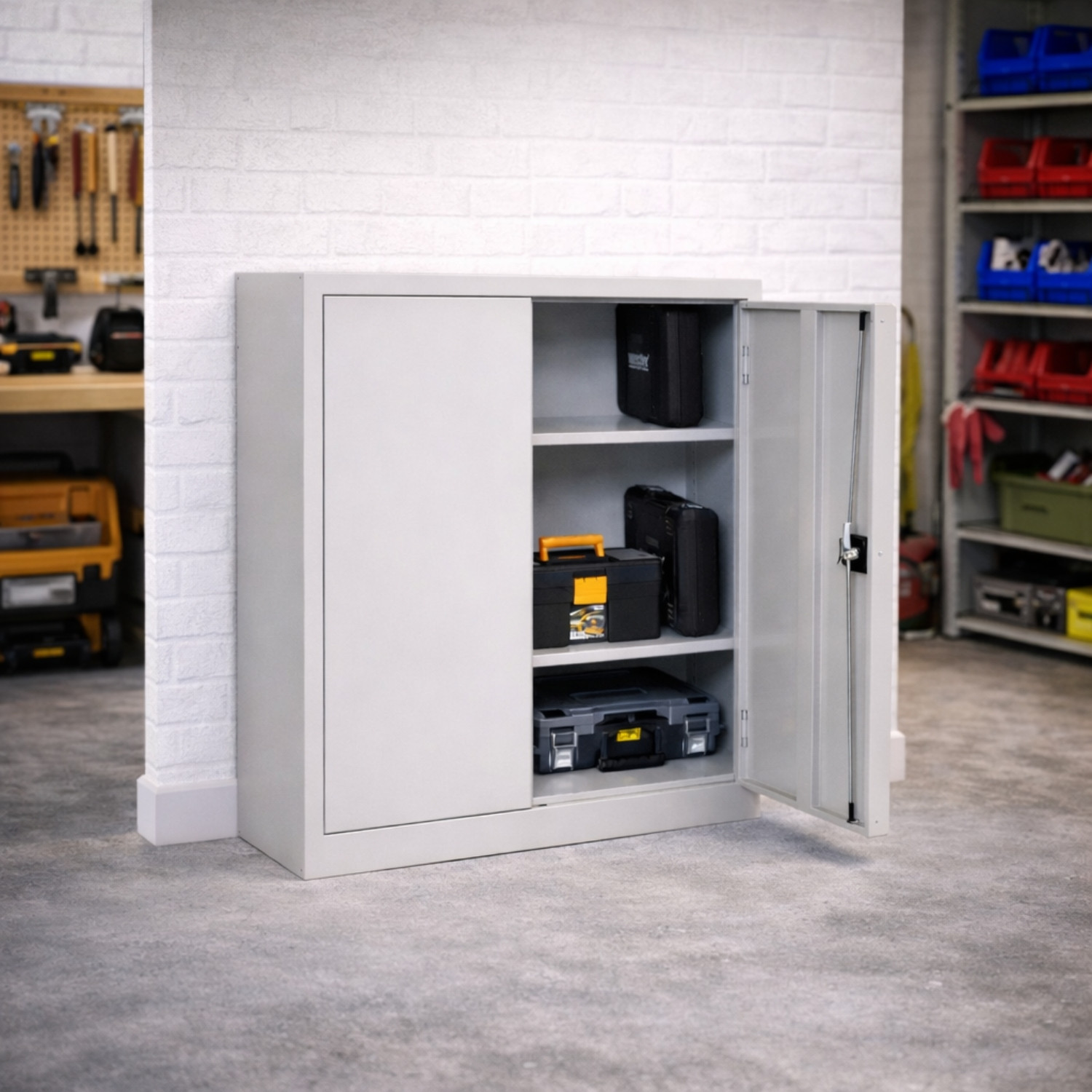 Skriňa má pevnú zváranú konštrukciu z kvalitného oceľového plechu, čo zaručuje vysokú odolnosť a bezpečné uloženie obsahu. Vo vnútri sa nachádzajú dve výškovo nastaviteľné police s nosnosťou až 80 kg. O bezpečnosť sa stará veľkoplošný otočný zámok, dodávaný s dvomi kľúčmi.