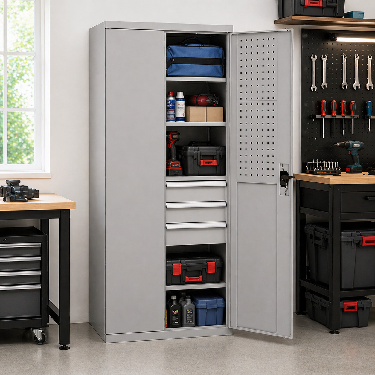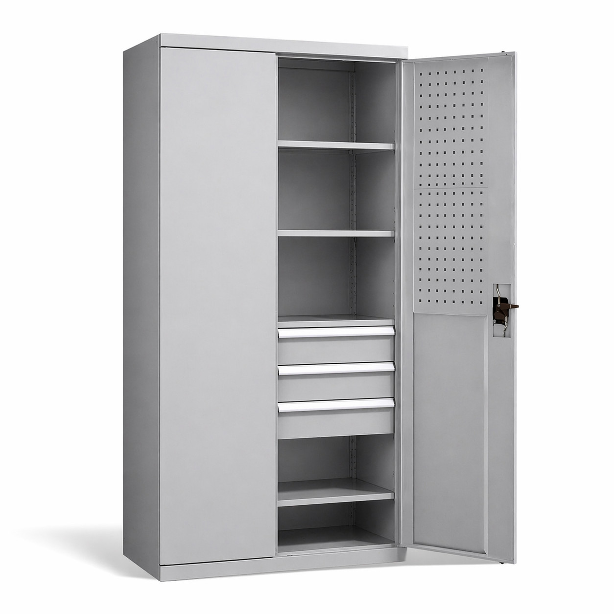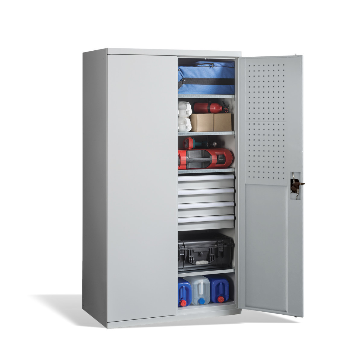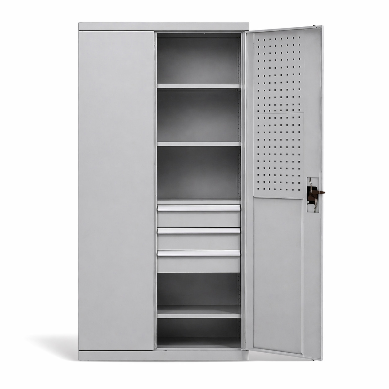 Vnútorný priestor tvoria 4 police s maximálnou nosnosťou 100 kg na každú policu a 3 zásuvky na ukladanie náradia s nosnosťou 70 kg. Umožňujú flexibilné usporiadanie priestoru podľa aktuálnych potrieb a bezpečné uloženie aj ťažších predmetov. Dvojdverová konštrukcia so spoľahlivým uzamykaním zvyšuje bezpečnosť uloženého obsahu a chráni ho pred neoprávneným prístupom. Vnútorné strany dverí sú vybavené perforovanými panelmi, ktoré umožňujú flexibilné uchytenie rôznych doplnkov podľa Vašich aktuálnych potrieb. Dvere je možné otvoriť až do uhla 180°, čím je zabezpečený maximálny komfort a plný prístup do celého vnútorného priestoru skrine.
