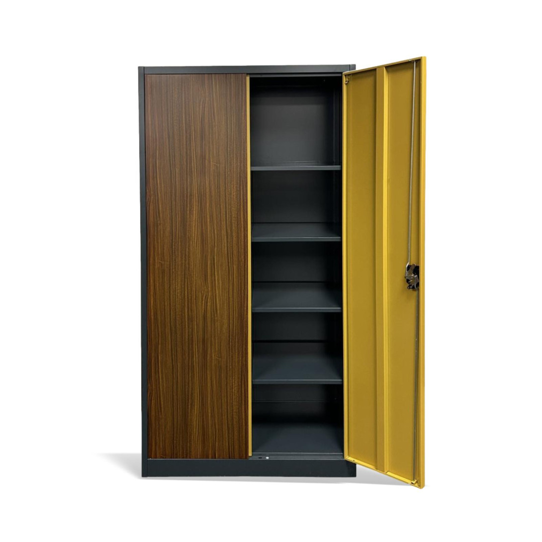 Korpus je vyrobený z oceľového plechu s hrúbkou 0,6 mm, čo zaručuje vysokú stabilitu a dlhodobú odolnosť. Dvere sa otvárajú až do uhla 110°, takže poskytujú komfortný prístup k uloženým veciam. Po celej dĺžke sú spevnené dvojitou výstuhou, vďaka čomu bez problémov zvládnu každodenné používanie. Zaujímavým detailom je aj vnútorná strana dverí v modernom žltom odtieni, ktorá oživuje celkový vzhľad a prináša do používania jemný farebný akcent.