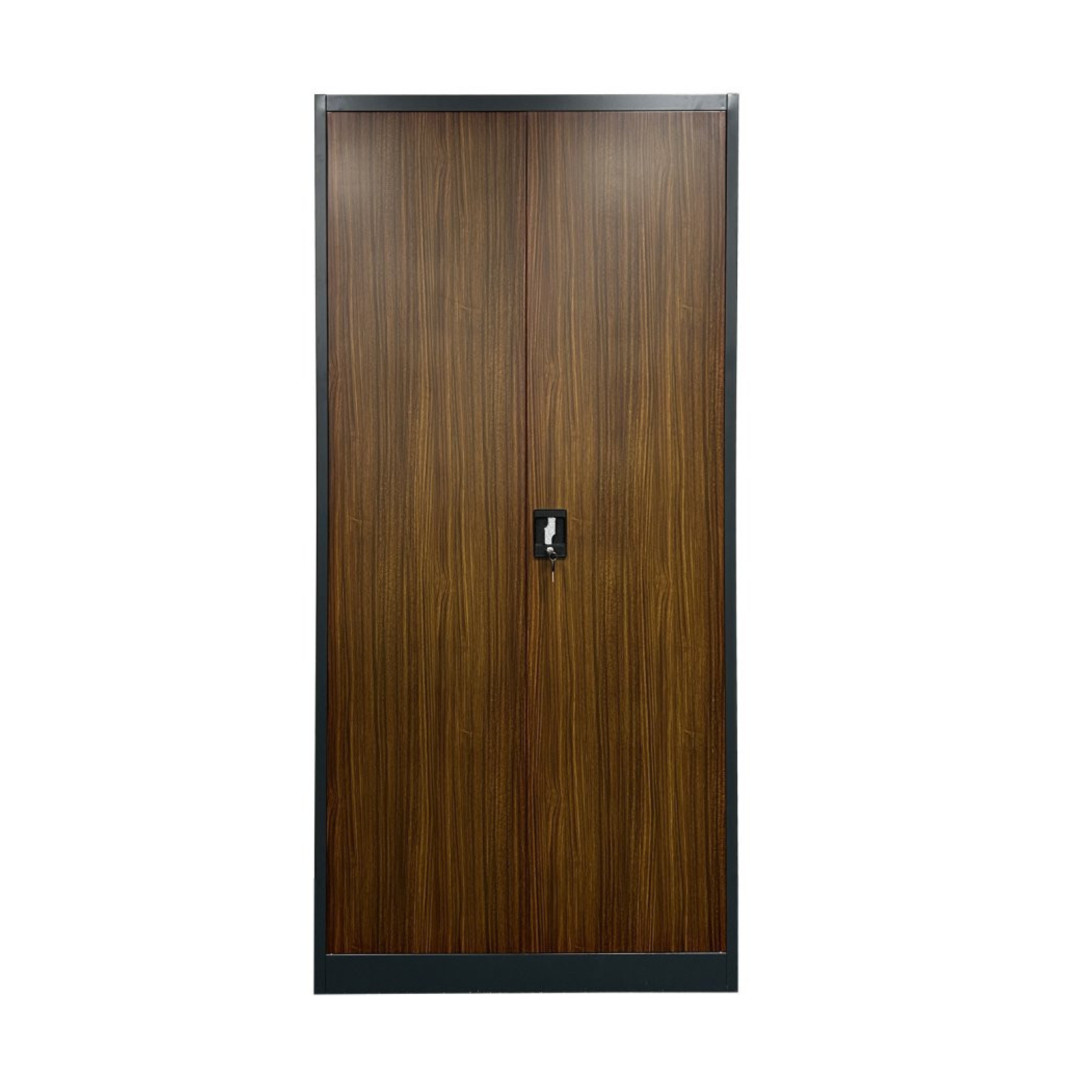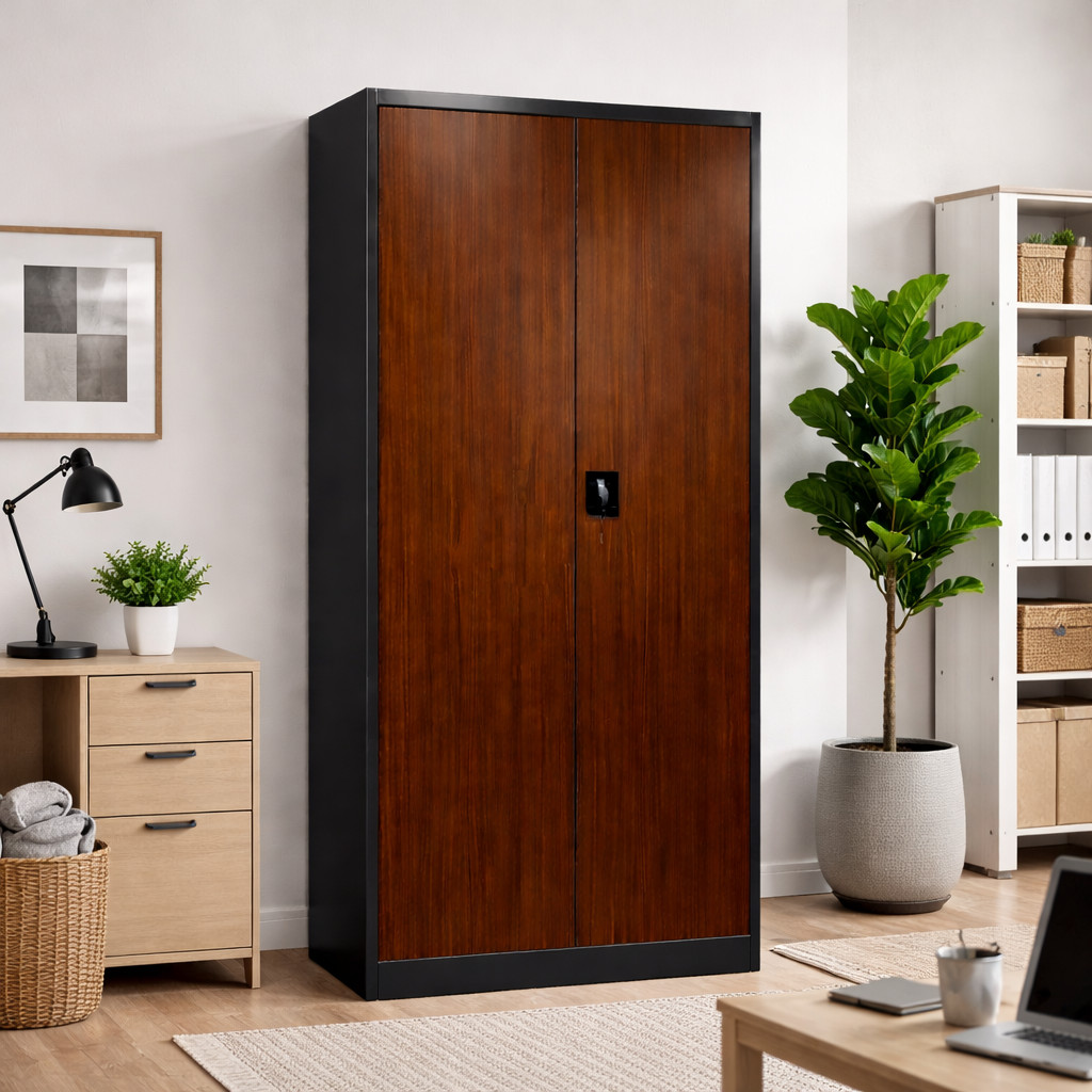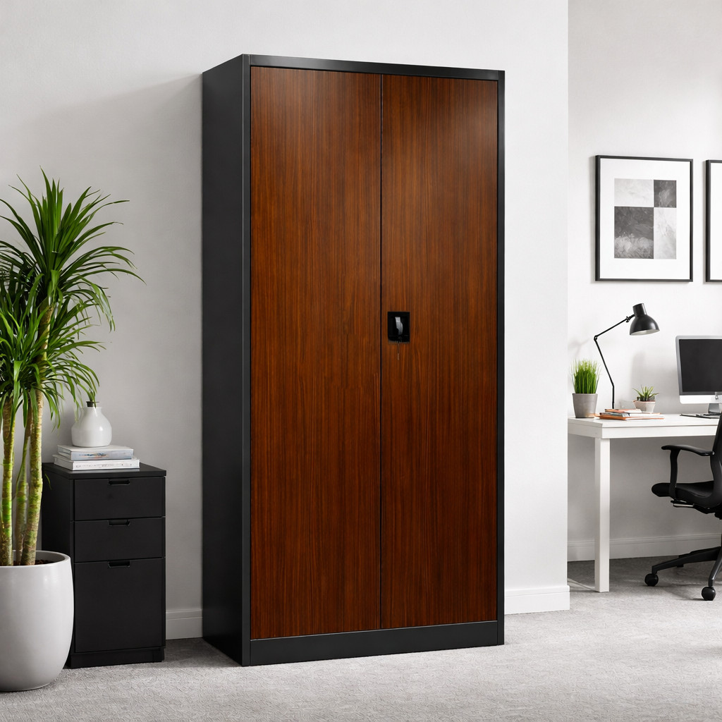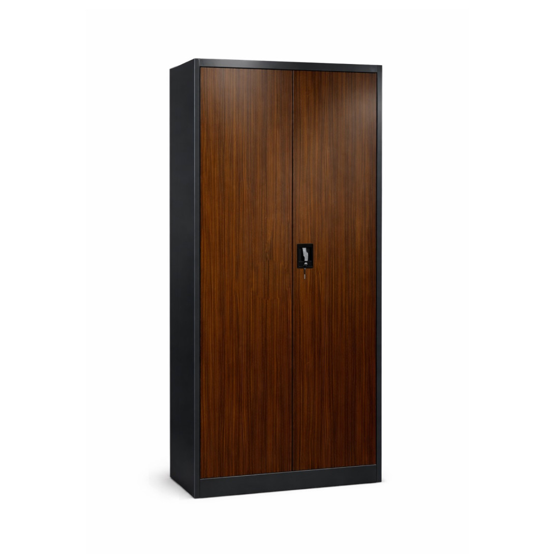 Táto kovová kancelárska skriňa spája funkčnosť s moderným dizajnom a ukazuje, že aj praktický úložný priestor môže byť vizuálne atraktívny. Kombinácia pevnej oceľovej konštrukcie v tmavom odtieni RAL 7016 a dverí v dekore tmavého dreva vytvára výrazný kontrast, ktorý prirodzene zapadne do kancelárie, zasadačky aj domáceho pracovného prostredia. Výsledkom je elegantný a profesionálne pôsobiaci kus nábytku s príjemným vzhľadom.