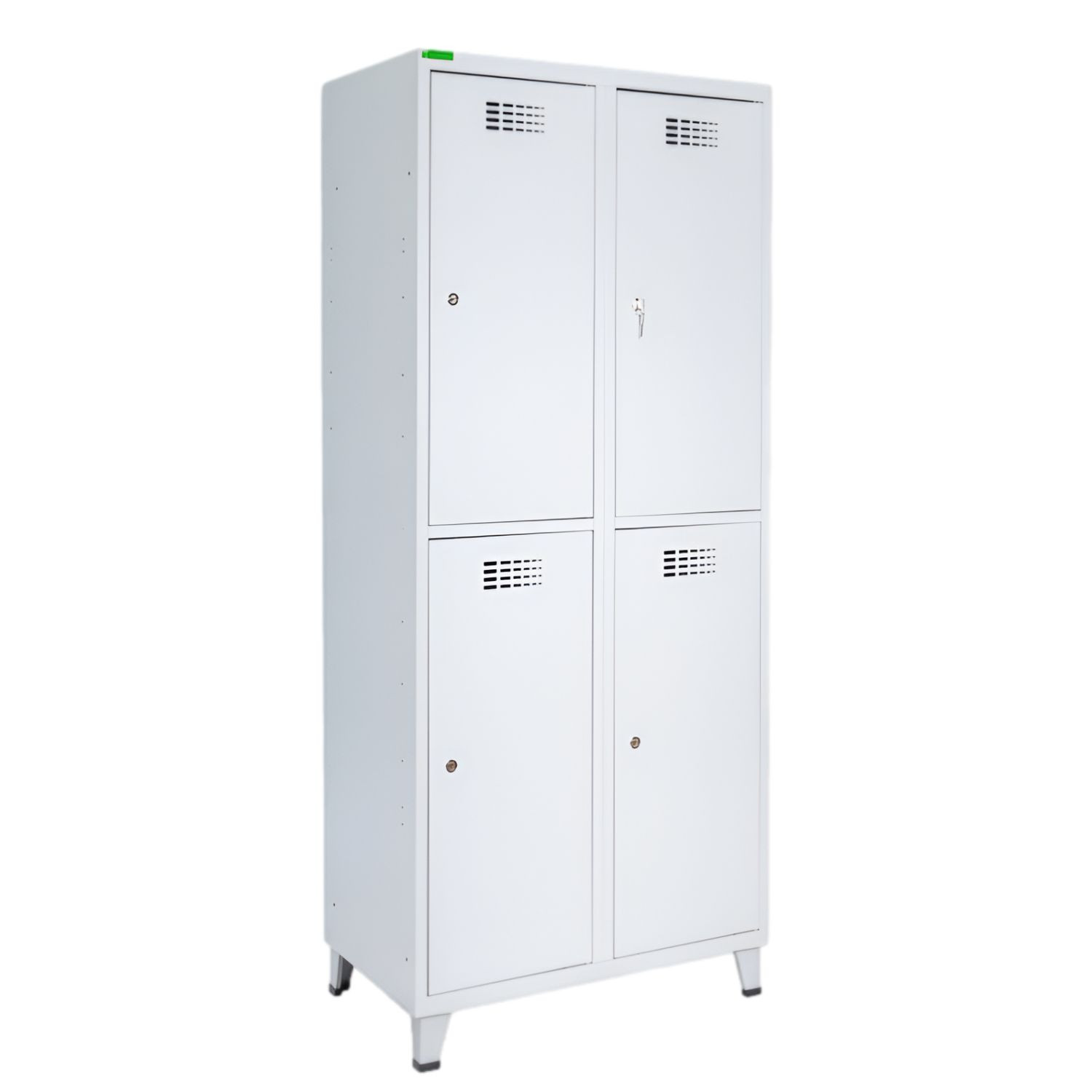4-dverová šatňová skriňa s krátkymi dvierkami je praktickým riešením pre školské šatne, firemné priestory či športové zariadenia. Jej konštrukcia je zváraná z kvalitného oceľového plechu 1. triedy a opatrená odolnou povrchovou úpravou. Skriňa poskytuje pohodlné uloženie oblečenia a vďaka ventilačným otvorom v hornej časti dverí zabezpečuje efektívne prúdenie vzduchu. Štandardná výbava svetlosivej kovovej skrine zahŕňa hornú policu, tyč na ramienka s dvomi háčikmi, zrkadielko a držiak na uterák. Uzamykanie je riešené cylindrickým zámkom. Na požiadanie je možné skriňu doplniť o uzávery na visiaci zámok, zámky s mechanickým alebo elektronickým kódom, zámky na mince či karty. Za príplatok sú k dispozícii aj farebné dvierka, šikmé striešky, nožičky alebo integrované lavičky.