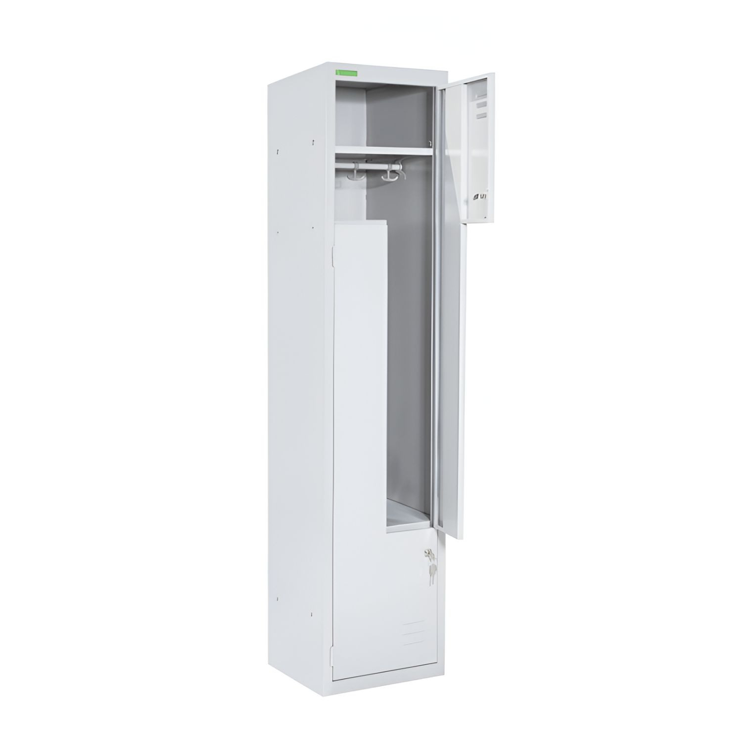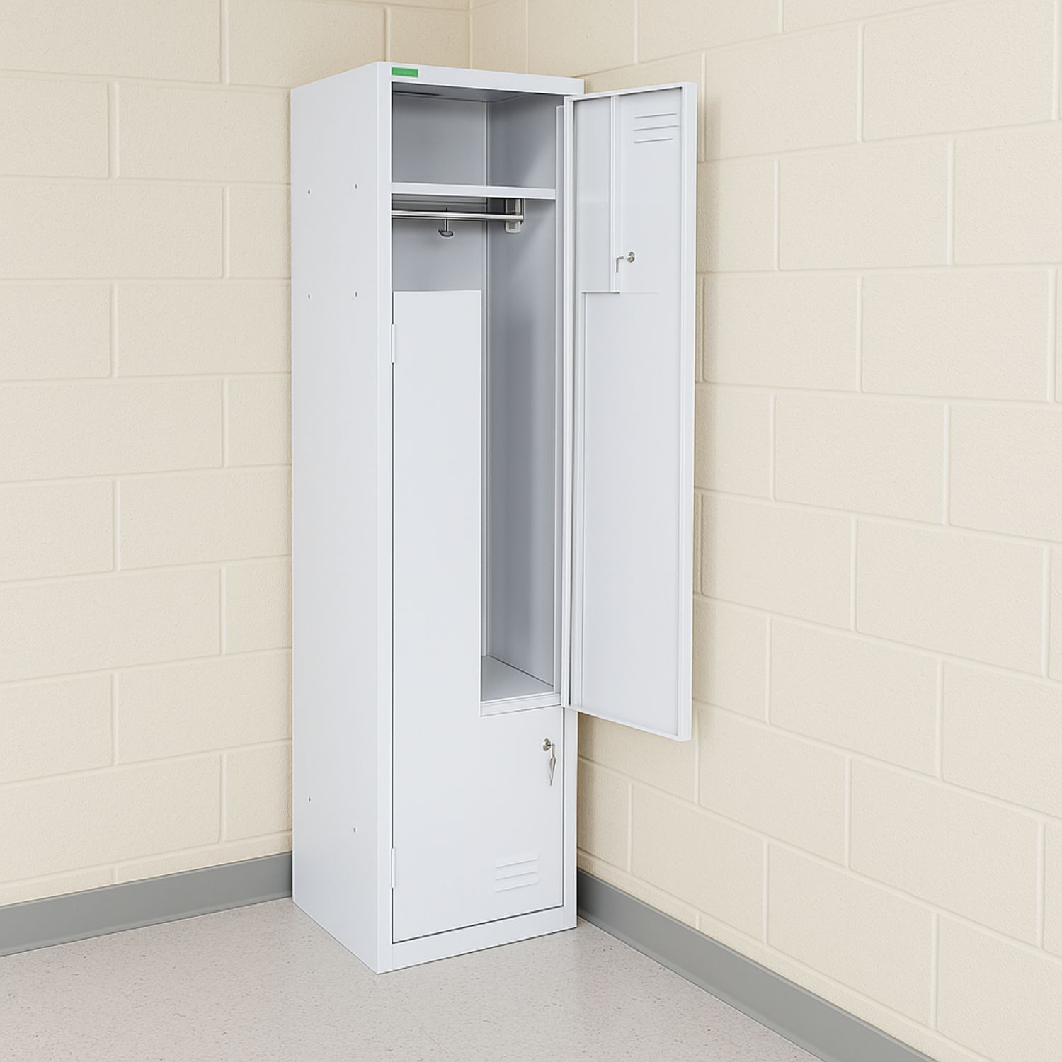 2-dverová šatníková skriňa LOCKER H Z2 400 so Z-dverami je navrhnutá pre priestory, kde je každé miesto vzácne. Vďaka šírke 400 mm patrí medzi najkompaktnejšie modely, no svojou konštrukciou ponúka prekvapivo rozsiahly a prakticky rozdelený úložný priestor. Tvar Z-dvierok umožňuje efektívne členenie vnútra skrine, takže používatelia získajú pohodlný priestor na odkladanie kabátov, topánok aj osobných vecí – bez obmedzenia komfortu pri používaní.