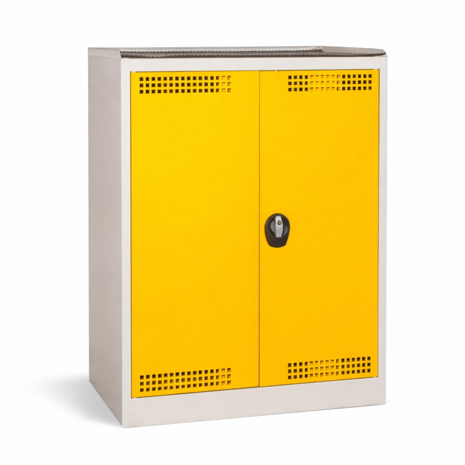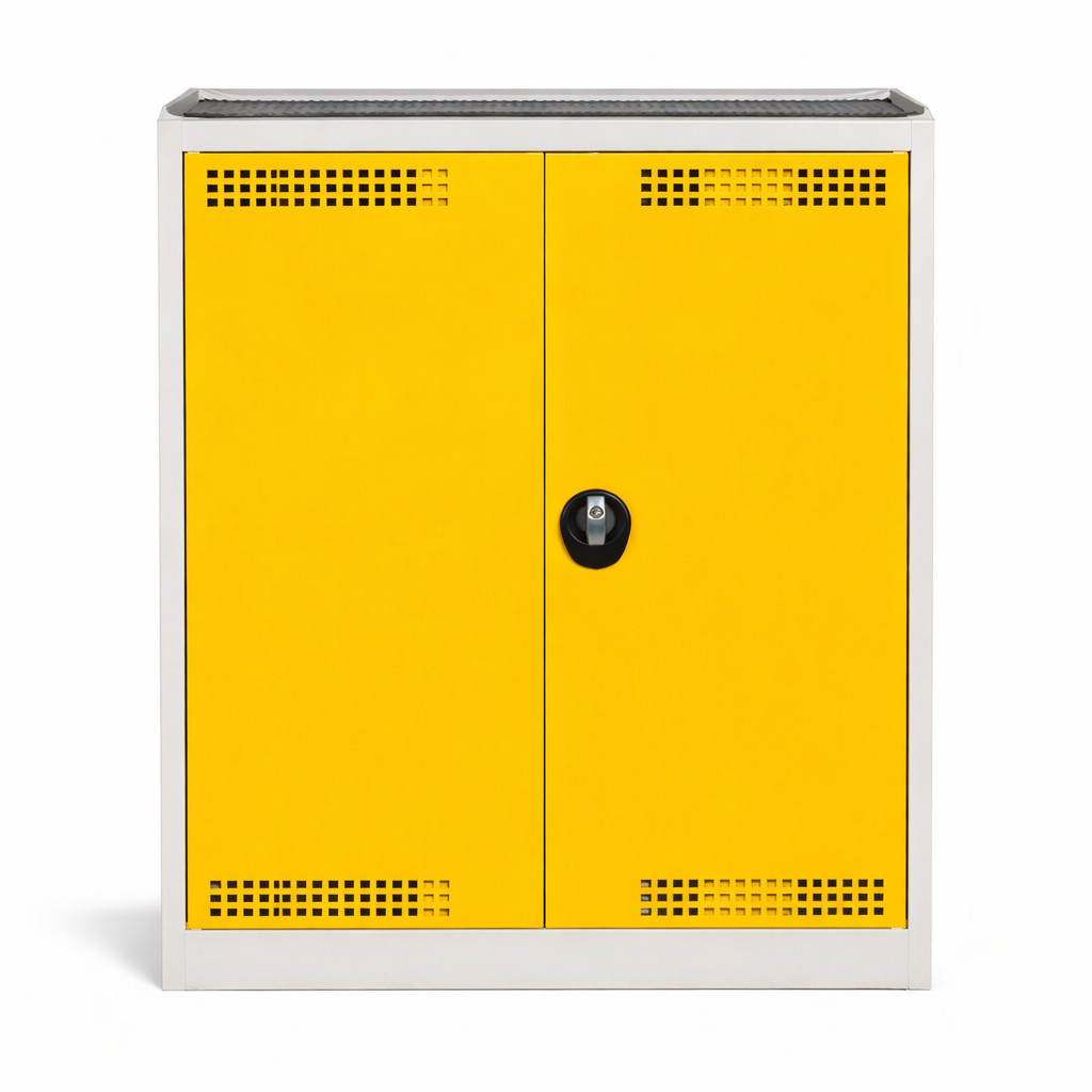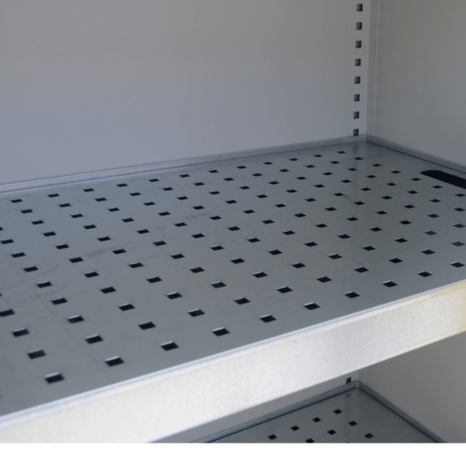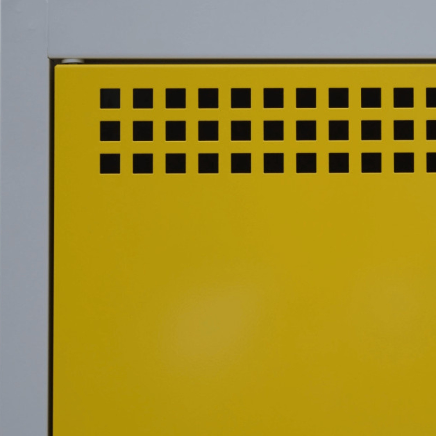 Masívna oceľová skriňa ponúka vysokú bezpečnosť, ktorú zaručuje dvojbodové uzamykanie dverí. Správnu cirkuláciu vzduchu zaisťuje perforované vetranie v hornej aj spodnej časti dverí.