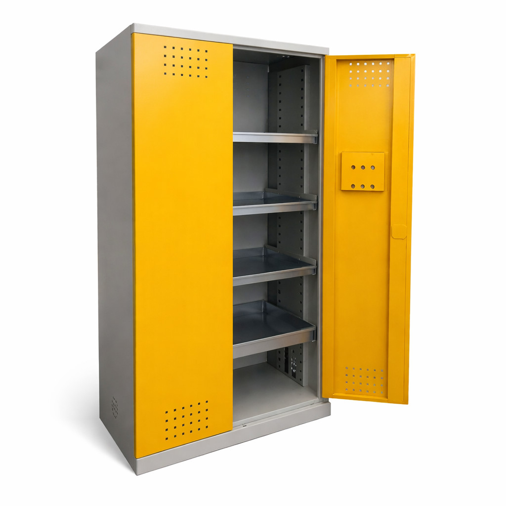 Séria skríň na chemikálie CHEMICAB je navrhnutá tak, aby spájala atraktívny dizajn s plnou funkčnosťou a súladom s predpismi pre bezpečné skladovanie chemikálií, farieb a jedov. Skriňa je vybavená štyrmi prestaviteľnými policami vo forme vaničky s robustným perforovaným pozinkovaným roštom. Tvar vaničiek je optimalizovaný na zachytenie unikajúcich kvapalín.
