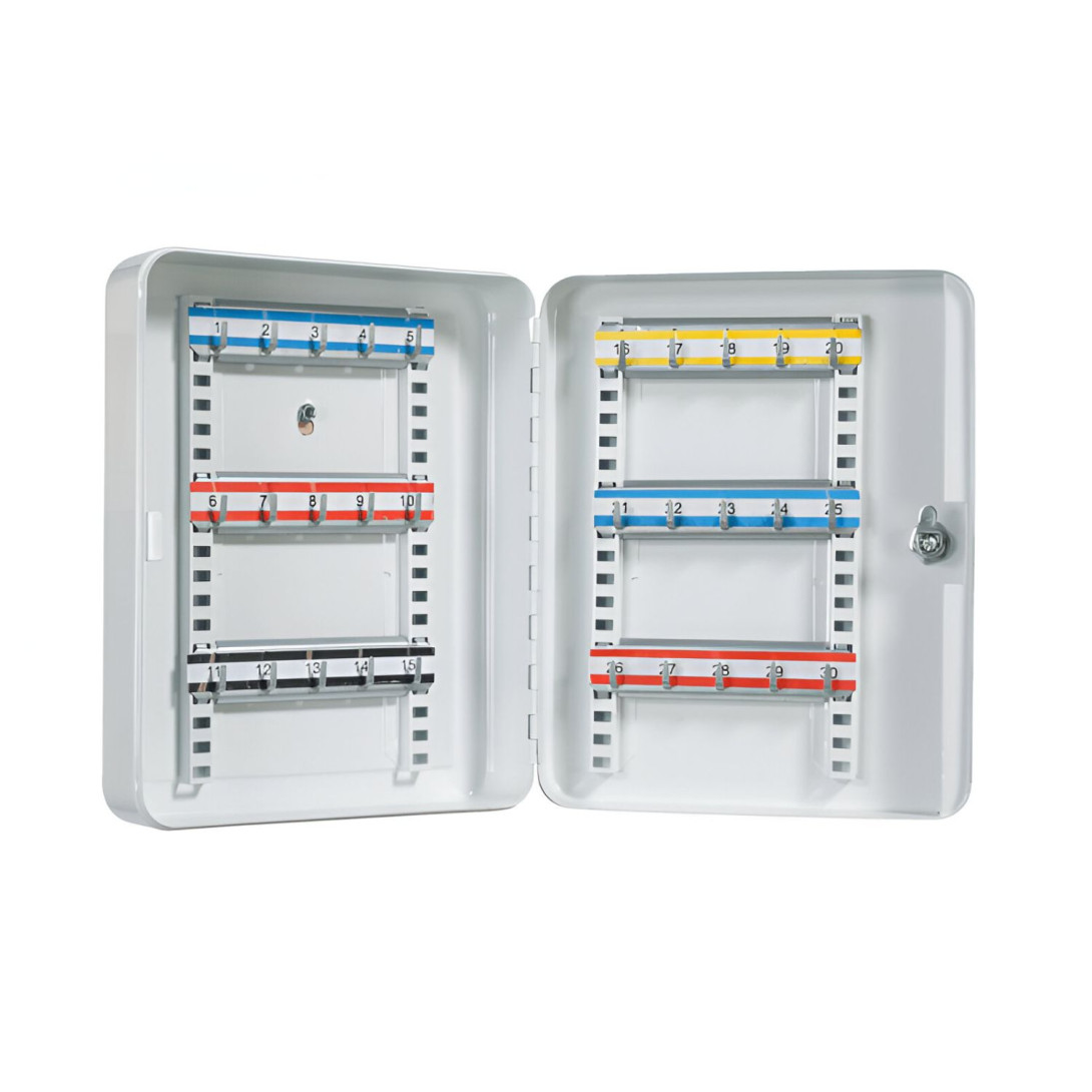 Máte doma alebo vo firme kľúče, pri ktorých netušíte, ku ktorým zámkom patria? Alebo strávite priveľa času ich hľadaním? Riešením je praktická skriňa na kľúče, ktorá vám pomôže udržať poriadok a prehľad. Vďaka očíslovaným farebným lištám s nastaviteľnou výškou a dokumentácii budete mať vždy jasno, ktorý kľúč kam patrí. Skriňa je vybavená nastaviteľnými lištami s pozinkovanými háčikmi, cylindrickým bezpečnostným zámkom s dvomi kľúčmi a dá sa jednoducho zavesiť na stenu. Robustné prevedenie z oceľového plechu I. triedy, povrchová úprava kvalitným práškovým lakom a elegantná signálne biela farba RAL 9002 z nej robia nielen funkčného, ale aj estetického pomocníka. Kompaktné rozmery 240 × 300 × 80 mm zaručujú, že si nájde miesto v každej kancelárii či domácnosti. Produkt Vám nevyhovuje? Pozrite si našu ponuku skriniek na kľúče.