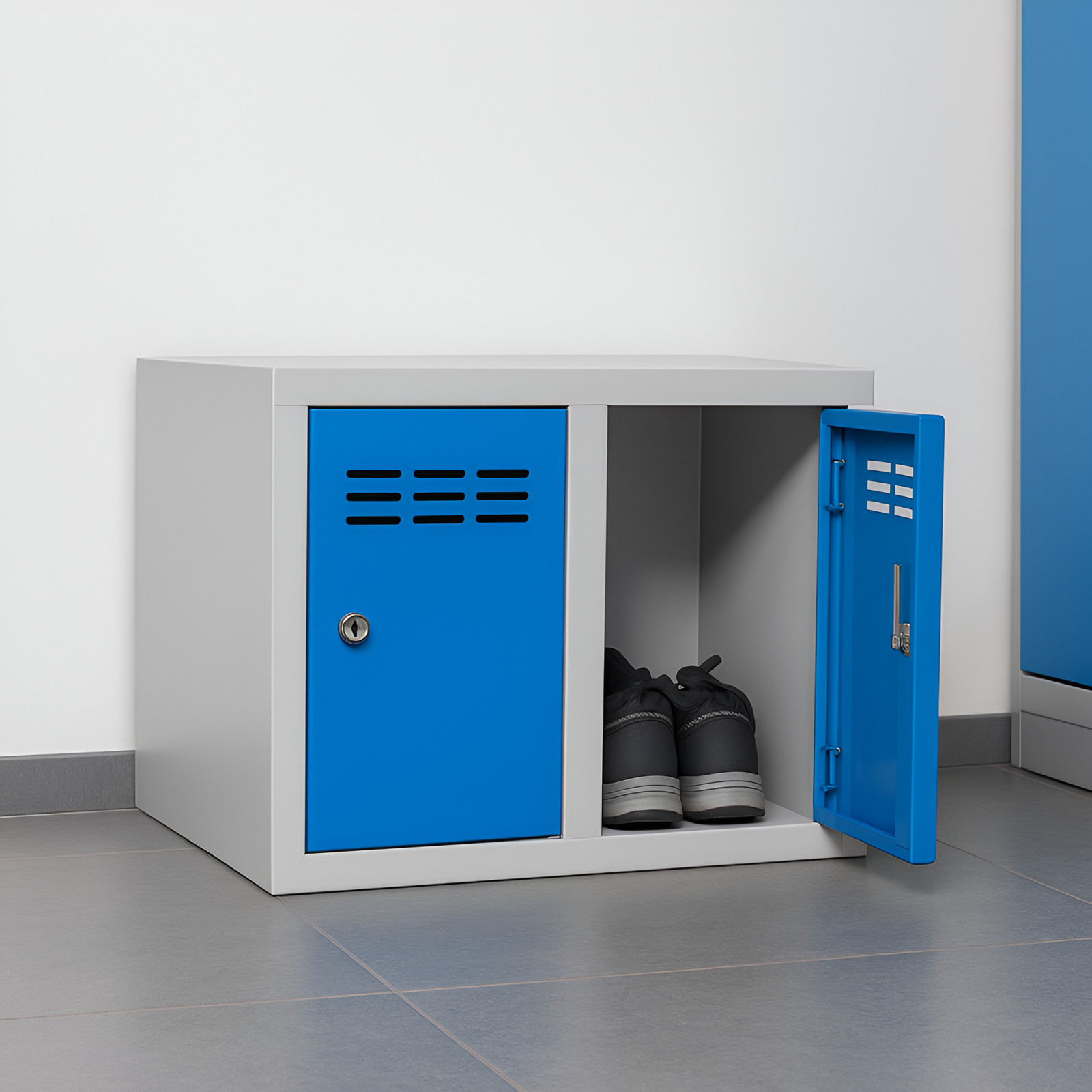 k potrebujete praktické riešenie na odkladanie obuvi v školách, výrobných prevádzkach či iných priestoroch, kde je nutné prezúvanie, malé skrinky na obuv sú ideálnou voľbou. Vďaka kompaktným rozmerom nezaberajú veľa miesta, no zároveň ponúkajú dostatok priestoru na uloženie obuvi. Skrinky sú vyhotovené v odolnej modrej farbe s povrchovou úpravou práškovým lakom, ktorý zaručuje ich dlhú životnosť a odolnosť voči každodennému používaniu. Na dvierkach sa nachádzajú otvory na vetranie, ktoré zabezpečujú cirkuláciu vzduchu a pomáhajú predchádzať nepríjemnému zápachu. Veľkou výhodou je možnosť kombinovať ich s inými modelmi rovnakej šírky, čo umožňuje vytvárať flexibilné zostavy podľa potrieb priestoru. Za príplatok je možné skrinky vybaviť uzávermi na visiaci zámok, zámkami s mechanickým alebo elektronickým kódom, zámkami na mince alebo na karty. Pre vyšší komfort je v ponuke aj tácka na obuv, ktorá chráni vnútro skrinky pred znečistením. Tieto malé skrinky na obuv prinášajú poriadok, hygienu a praktickosť do každého prostredia. Ak hľadáte iný typ skriniek či doplnkov, pozrite sa do našej ponuky alebo sa nám ozvite – radi vám ochotne pomôžeme s výberom.