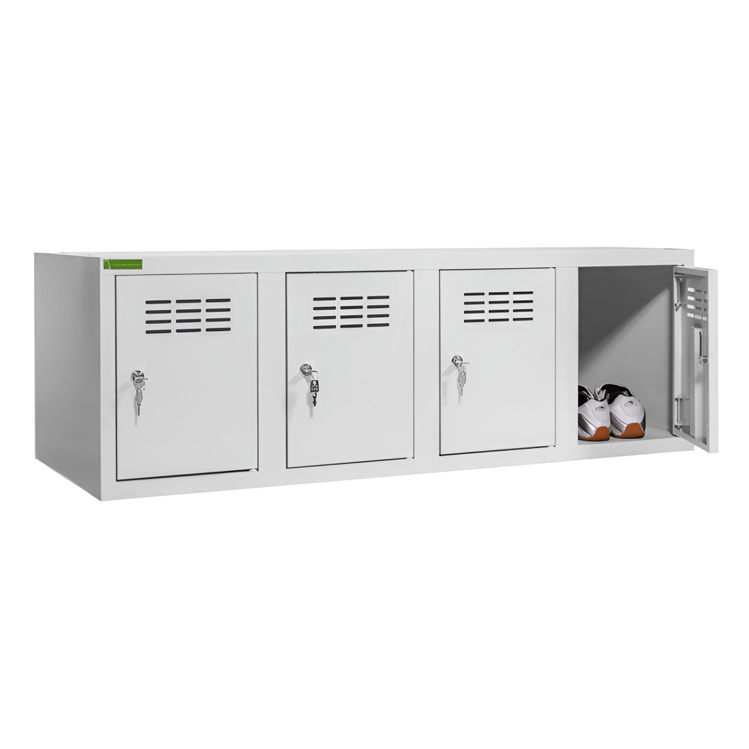 Malé skrinky na obuv sú praktickým riešením pre školy, výrobné prevádzky či iné miesta, kde je potrebné prezúvanie. Vďaka svojim kompaktným rozmerom nezaberajú veľa miesta, no zároveň poskytujú dostatok priestoru na uloženie obuvi. Vyhotovené sú v odolnej svetlosivej farbe RAL 7035 s povrchovou úpravou práškovým lakom, čo zabezpečuje ich dlhú životnosť a odolnosť voči každodennému používaniu. Na dvierkach sa nachádzajú otvory na vetranie, ktoré zaisťujú cirkuláciu vzduchu a bránia nepríjemnému zápachu. Skrinky je možné kombinovať s inými skriňami rovnakej šírky, čo umožňuje vytvárať praktické zostavy podľa potrieb priestoru. Výnimočnosť týchto skriniek spočíva aj v možnostiach uzamykania – za príplatok je možné vybaviť ich uzávermi na visiaci zámok, zámkami s mechanickým alebo elektronickým kódom, zámkami na mince alebo karty. Pre ešte väčší komfort je k dispozícii aj tácka na obuv, ktorá chráni vnútro skrinky pred znečistením. Tieto malé skrinky na obuv tak ponúkajú nielen funkčné, ale aj estetické riešenie, ktoré prináša poriadok, hygienu a flexibilitu do každého prostredia.
