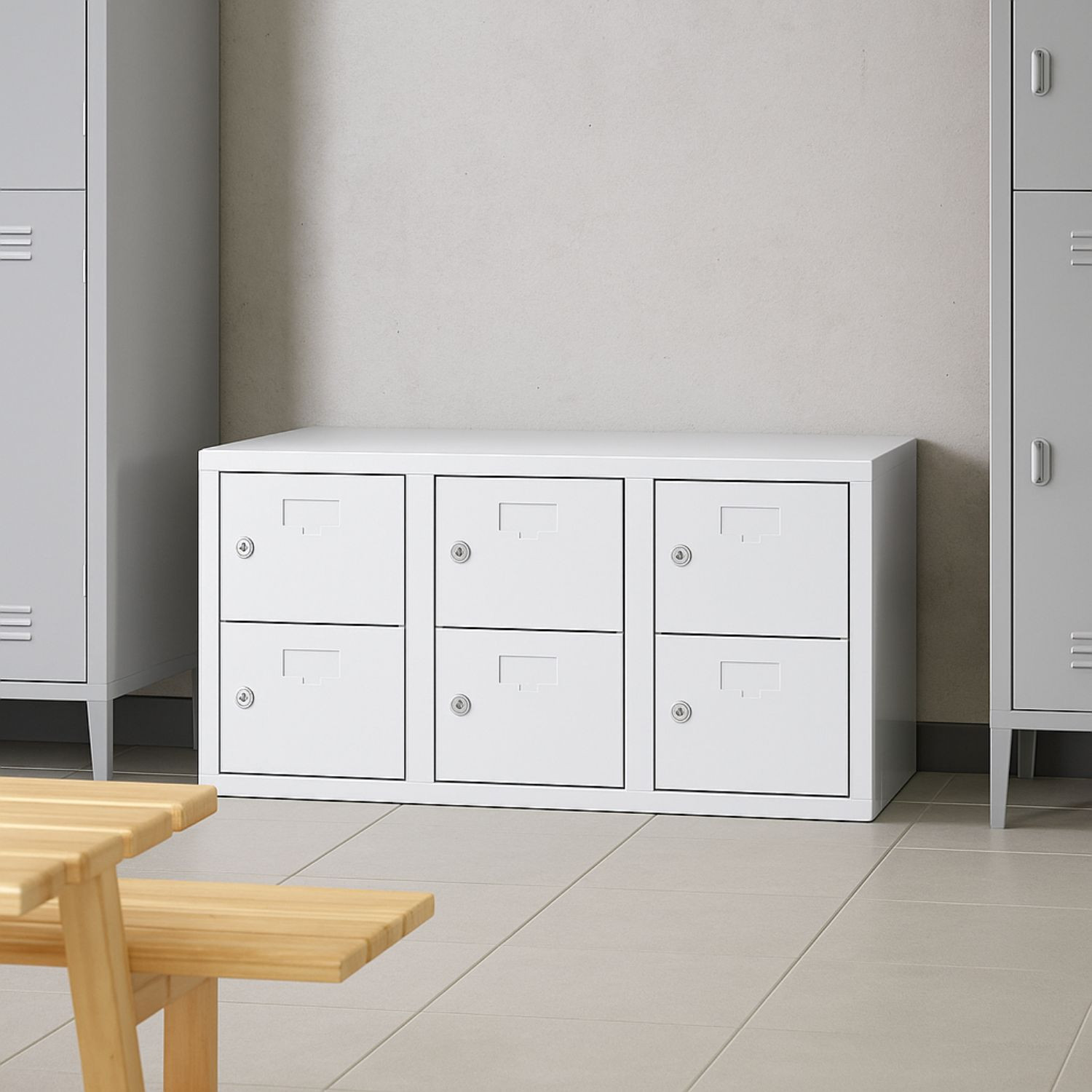 Malé skrinky na obuv sú praktickým riešením pre školy, výrobné prevádzky či iné miesta, kde je potrebné prezúvanie. Vďaka svojim kompaktným rozmerom nezaberajú veľa miesta, no zároveň poskytujú dostatok priestoru na uloženie obuvi. Vyhotovené sú v odolnej svetlosivej farbe RAL 7035 s povrchovou úpravou práškovým lakom, čo zabezpečuje ich dlhú životnosť a odolnosť voči každodennému používaniu. Na dvierkach sa nachádzajú otvory na vetranie, ktoré zaisťujú cirkuláciu vzduchu a bránia nepríjemnému zápachu. Skrinky je možné kombinovať s inými skriňami rovnakej šírky, čo umožňuje vytvárať praktické zostavy podľa potrieb priestoru. Výnimočnosť týchto skriniek spočíva aj v možnostiach uzamykania – za príplatok je možné vybaviť ich uzávermi na visiaci zámok, zámkami s mechanickým alebo elektronickým kódom, zámkami na mince alebo karty. Pre ešte väčší komfort je k dispozícii aj tácka na obuv, ktorá chráni vnútro skrinky pred znečistením. Tieto malé skrinky na obuv tak ponúkajú nielen funkčné, ale aj estetické riešenie, ktoré prináša poriadok, hygienu a flexibilitu do každého prostredia.