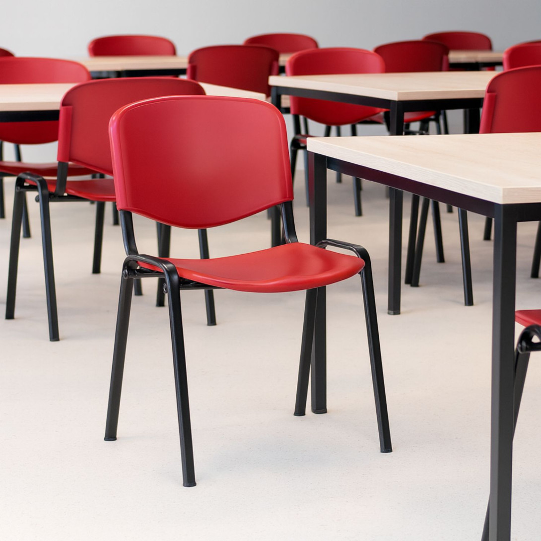 Stolička zaujme nielen svojimi praktickými vlastnosťami, ale aj výrazným vzhľadom. Pevné kovové nohy v čiernej farbe sú harmonicky spojené s ergonomicky tvarovaným plastovým sedadlom v červenom prevedení, ktoré dodá priestoru energiu a moderný charakter. S nosnosťou až 130 kg je stolička vhodná do domácností, kancelárií aj frekventovanejších jedální.