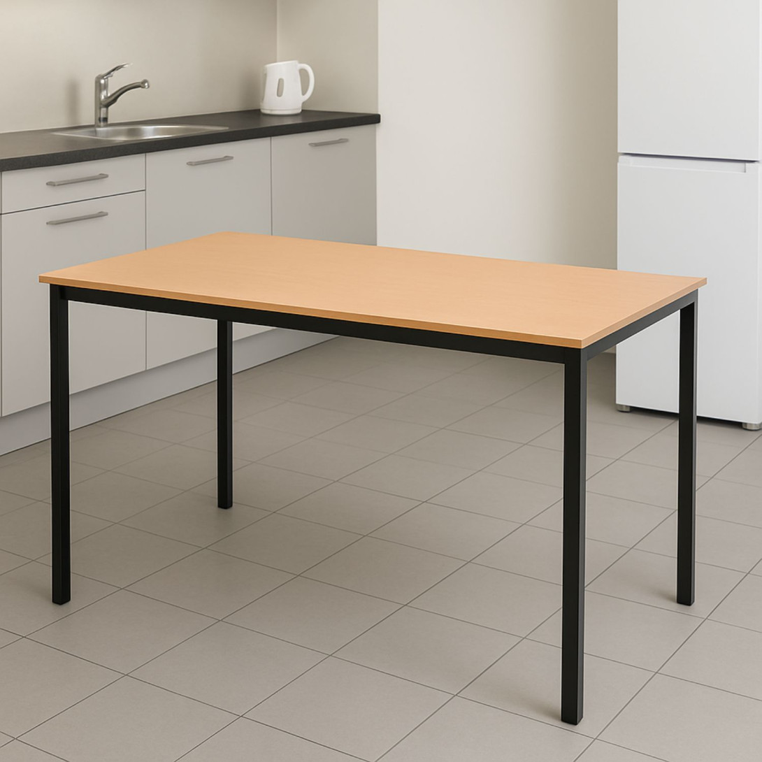 Doska s hrúbkou 18 mm poskytuje vysokú pevnosť a odolnosť voči bežnému opotrebeniu. Dekór imitujúci bukové drevo dodáva stolu hrejivý prírodný vzhľad, zatiaľ čo rovné hrany podčiarkujú jeho čistý a moderný charakter. Stabilitu zabezpečuje pevná kovová konštrukcia ošetrená kvalitným práškovým lakom, ktorý chráni povrch pred poškodením a uľahčuje údržbu.