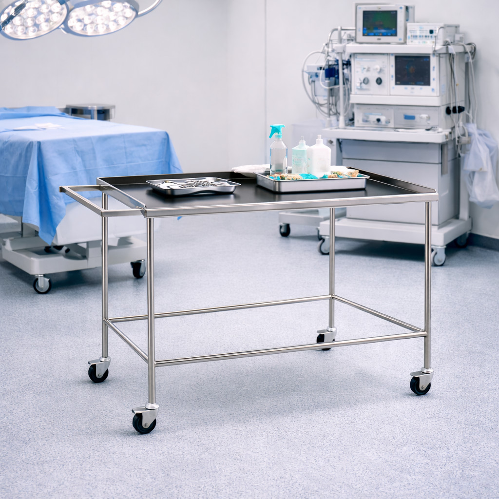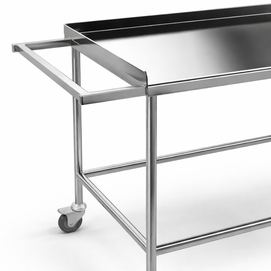 Stolík je vyrobený z vysokokvalitnej nerezovej ocele, ktorá zaručuje dlhú životnosť, jednoduché čistenie a maximálnu odolnosť voči korózii a dezinfekčným prostriedkom. Pracovná plocha s rozmermi 880 × 1400 × 600 mm poskytuje dostatok priestoru na bezpečné uloženie prístrojov, pomôcok alebo materiálu. Ochranná nerezová hrana z troch strán zabraňuje skĺznutiu alebo pádu predmetov počas presunu.