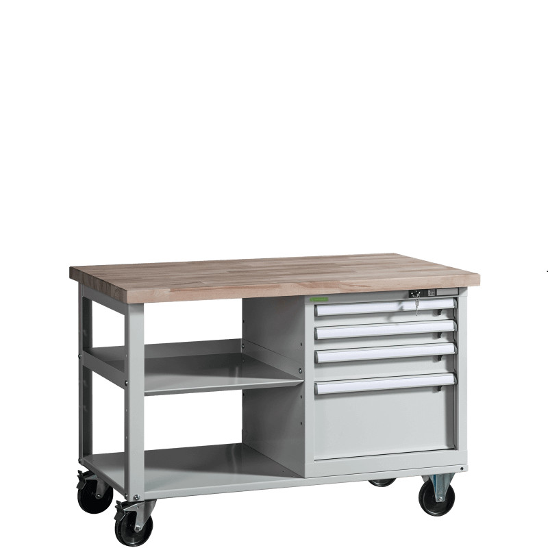 Pracovné stoly série VWB PK nachádzajú uplatnenie v dielňach, výrobných halách, servisných prevádzkach, školských odborných učebniach aj v technických miestnostiach. Tento konkrétny produkt patrí do kategórie ROLL, ktorý je vybavený kolieskami. Tie umožňujú jednoduchý presun stola v rámci priestoru a zvyšujú flexibilitu pri organizácii pracoviska, najmä tam, kde sa často mení rozloženie alebo charakter práce. Okrem toho sa pod stolom nachádzajú dve otvorené police a 4 zásuvky s centrálnym uzamykaním, ktoré zvyšujú pohodlie a poriadok pri práci.