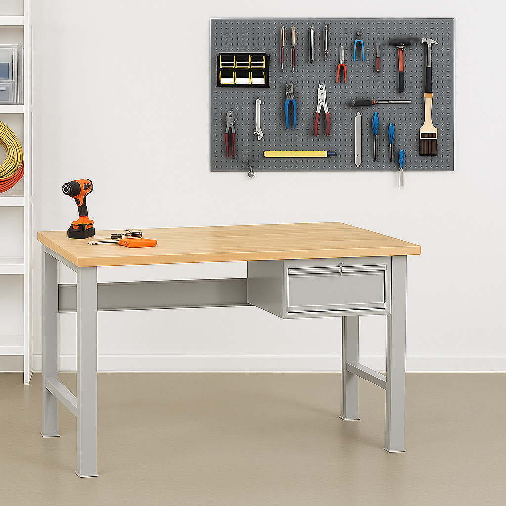 Tento pracovný stôl kombinuje odolnú konštrukciu, veľkorysú pracovnú plochu a praktické úložné riešenie – ideálny pre profesionálov aj domácich majstrov.