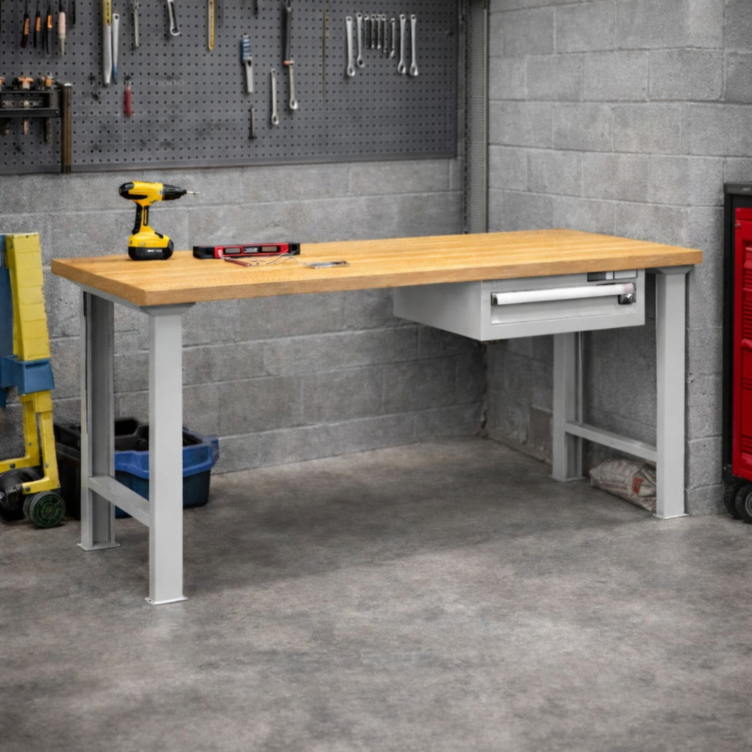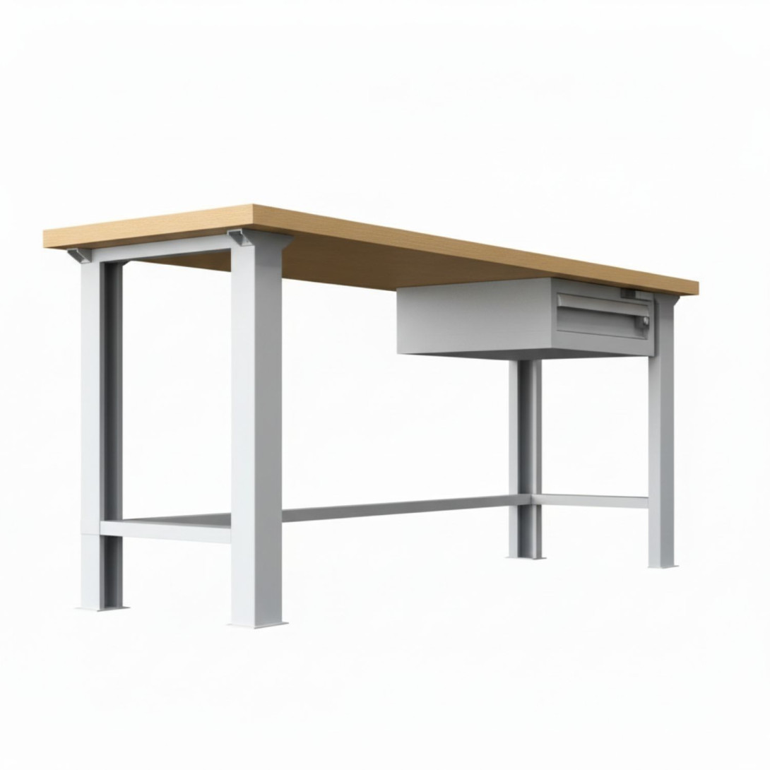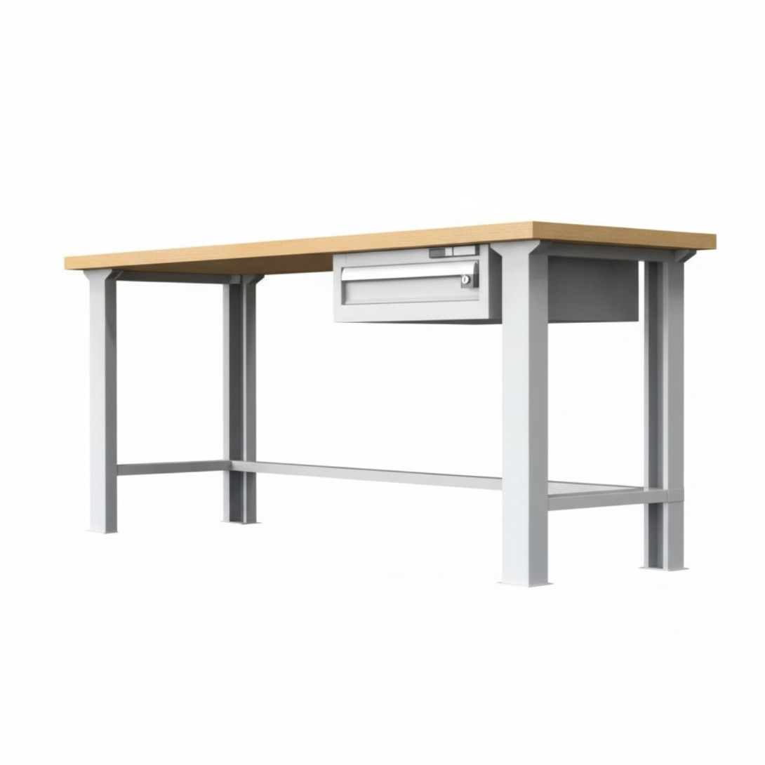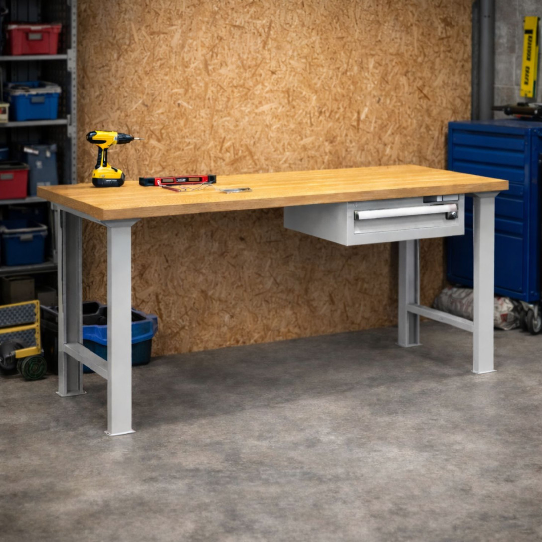 Centrálne zamykanie (s dvomi kľúčmi) umožňuje uzavrieť zásuvku. Buková pracovná doska s hrúbkou 40 mm má nosnosť až 800 kg a zaručuje maximálnu odolnosť aj pri náročnom používaní. Tento model je vybavený jednou zásuvkou na jednej strane.
