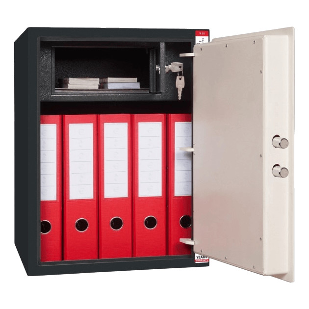 Trezor je vybavený kľúčovým zámkom, ktorý zaručuje bezpečné a pohodlné uzamknutie. Jeho vnútorný priestor je prakticky členený – obsahuje odnímateľnú policu a vnútornú uzamykateľnú skrinku, ktoré umožňujú prehľadné usporiadanie uložených predmetov.