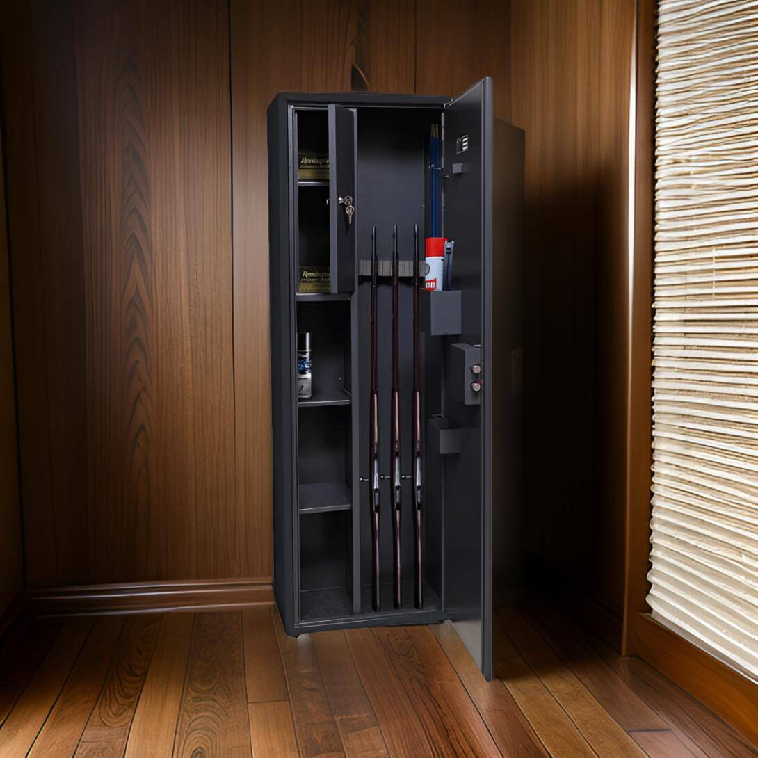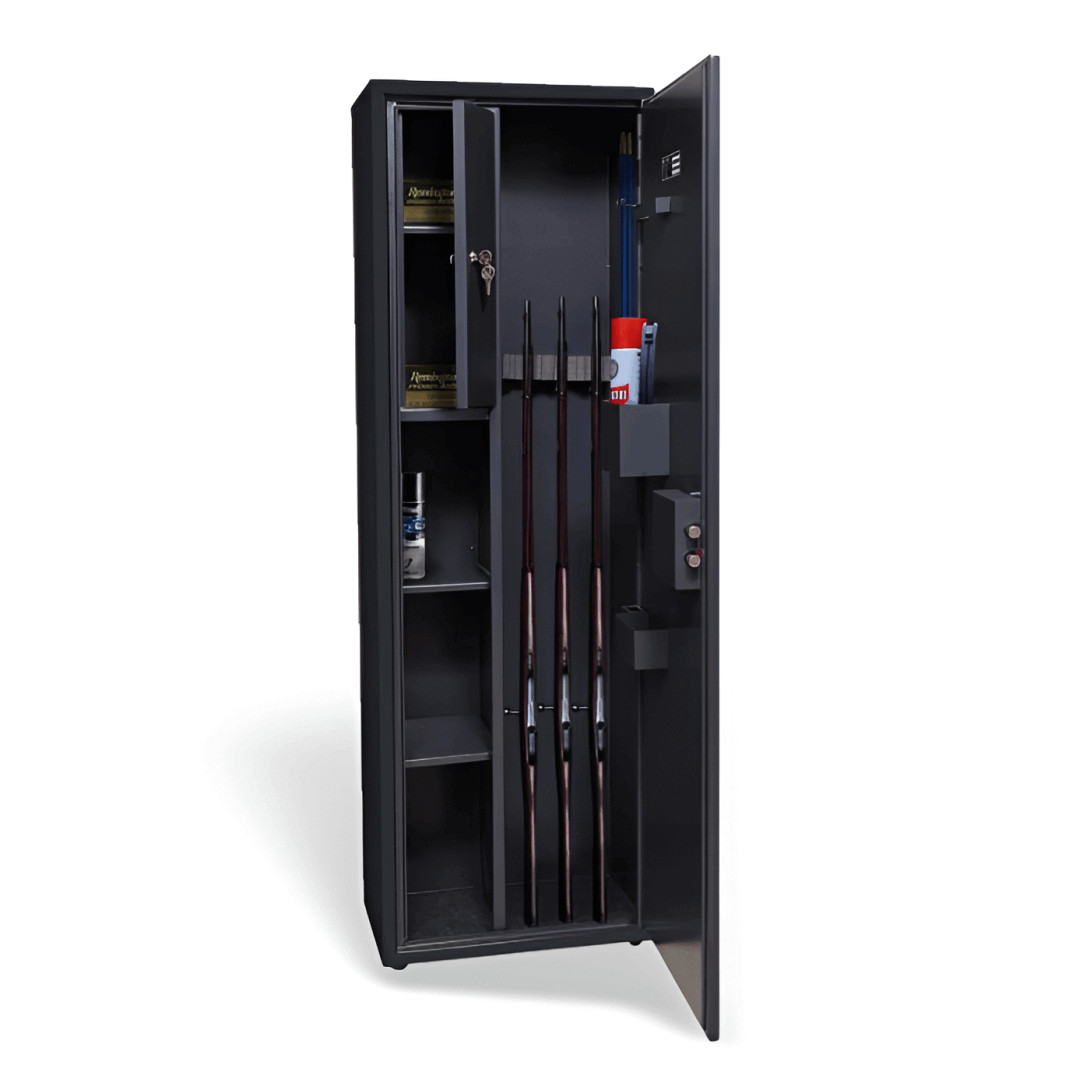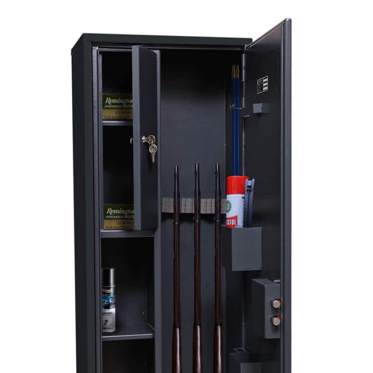 Vnútorný priestor je premyslene rozdelený – umožňuje uloženie až 4 dlhých zbraní s maximálnou dĺžkou 1260 mm. Súčasťou vybavenia sú 2 police a uzamykateľná skrinka s ďalšou policou na strelivo alebo menšie doplnky. Dvere disponujú praktickými držiakmi na strelivo, dokumenty, ďalekohľad či čistiace potreby, vďaka čomu máte všetko potrebné vždy poruke.
