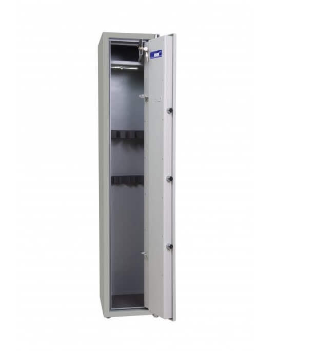 Elegantné sivé prevedenie RAL 7040 pôsobí moderne a nenápadne, vďaka čomu sa trezor hodí do rôznych typov interiérov – od domácností až po poľovnícke chaty. Rozmery modelu sú 1512 × 300 × 350 mm, pričom jeho robustná konštrukcia a certifikát bezpečnosti zaručujú spoľahlivú ochranu obsahu.